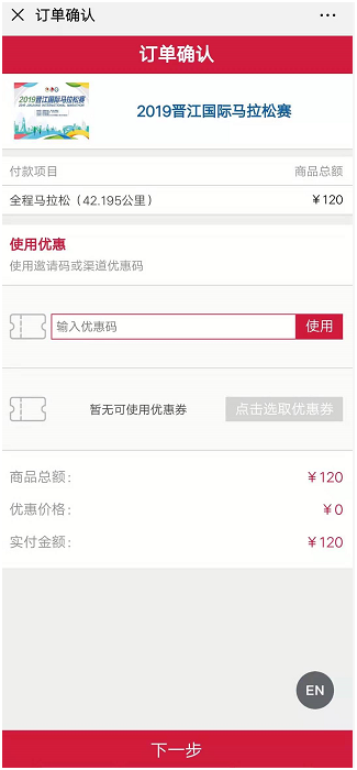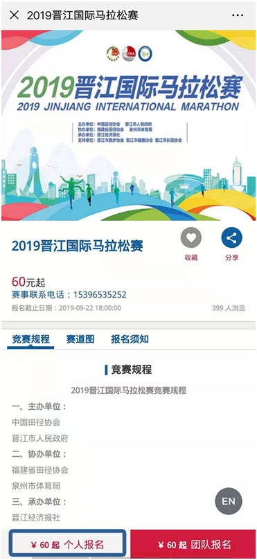 关注晋江国际马拉松赛官方微信公众号,点击菜单的“报名入口”按钮,即可直达报名页面: