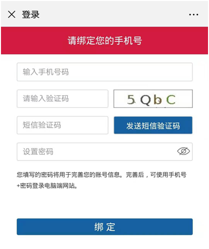 点击“个人报名”,如您已经绑定过帐号,则直接进入报名填写页面,如您未绑定帐号,则需进行手机绑定,如下图: