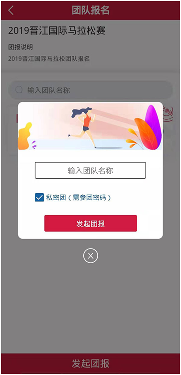 第二步:团长创建自己的团队,输入”跑团名称“(注:名称不能重复),【发起团报】;