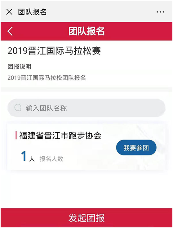 第五步:其他成员打开报名网址,点击【团队报名】,在搜索栏搜索自己团队的名称,点击【我要参团】