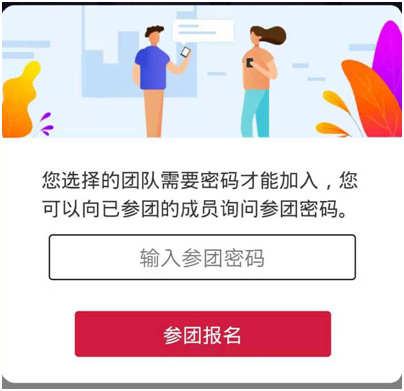 第六步:输入自己团队的“参团密码”(参团密码大小写须一致),入团之后选择项目和个人信息报名,提交订单付款,即可成功团报。