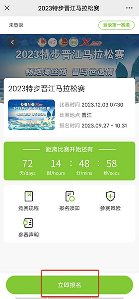 关注"晋江马拉松"微信公众号,点击菜单的“我要报名”按钮,即可直达报名页面: