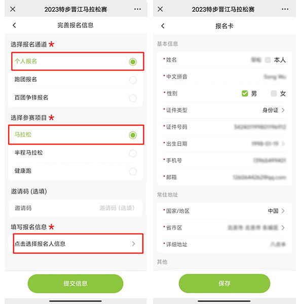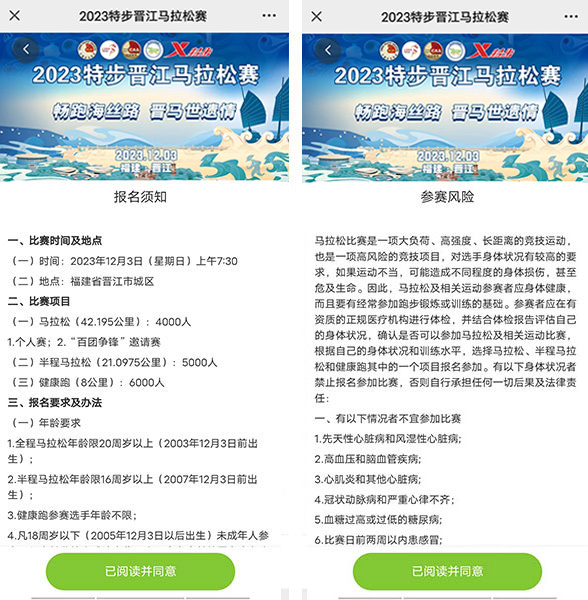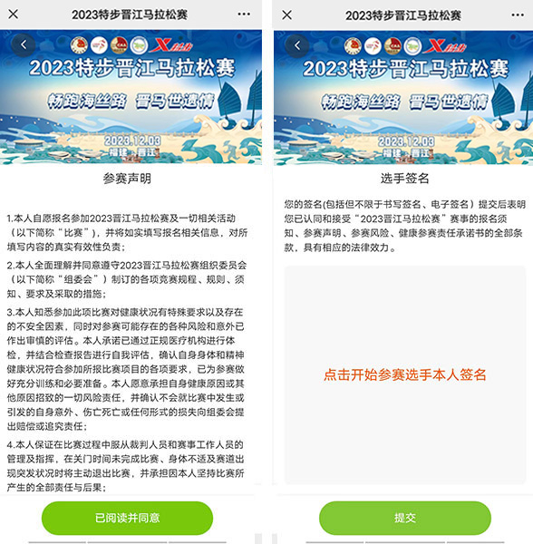 报名总体流程:“晋江马拉松赛”官网、官微点击“我要报名”→选择“立即报名”→关注“第一赛道”公众号→认真阅读报名须知、参赛风险→选择“报名通道”→选择参赛项目→填写信息→按要求上传参赛资质证明→仔细阅读参赛声明→签署姓名→支付报名费。支付成功后等待工作人员审核报名资料通过后即报名成功。