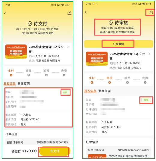 阅读参赛声明,签署姓名,支付订单,完成报名流程(等待审核通过,审核未通过选手将收到短信通知报名截止前重新提交符合要求的证明材料。