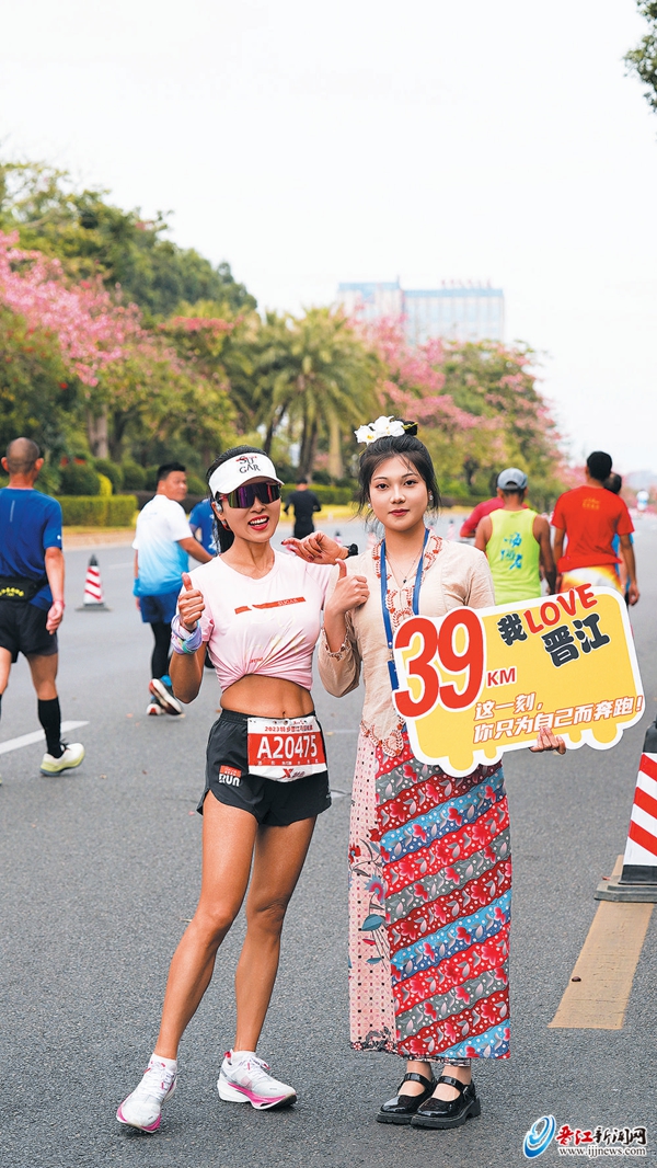 晋江新闻网12月4日讯 “加油!” “好特别的小姐姐!”“Give me five!”……昨日上午,在2023特步晋江马拉松赛的“最美赛道”上,一个个娘惹装扮的举牌宝贝,将赛道装点得更具风情。