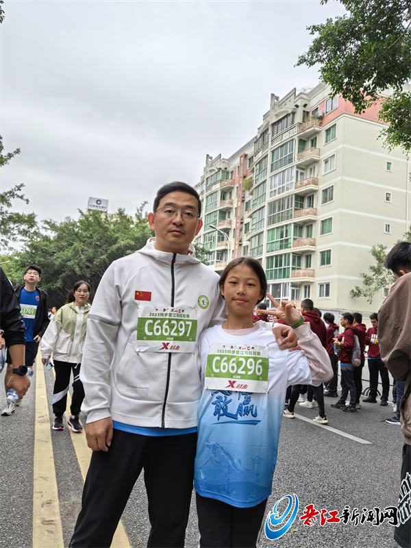 福州市晋江商会跑团团长吴培森带着小学四年级的女儿吴涵媛参加了健康跑。他说:“我一般都是参加半马。这次陪女儿跑8公里,完赛时她非常开心。”