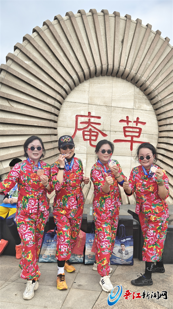 “我们姐妹都爱笑爱玩,所以取名‘晋江少女队’,希望永远保持少女心态。”陈丽玉说,选择穿大花袄是姐妹们一致的决定。“我们平时工作穿得比较正式,这次想在赛道上穿点不一样的。最近,这种民族风的大花袄很火,于是我们就想跟着潮流,学学网红穿搭,说不定,我们也能当一回网红呢!” 四姐妹笑着说。