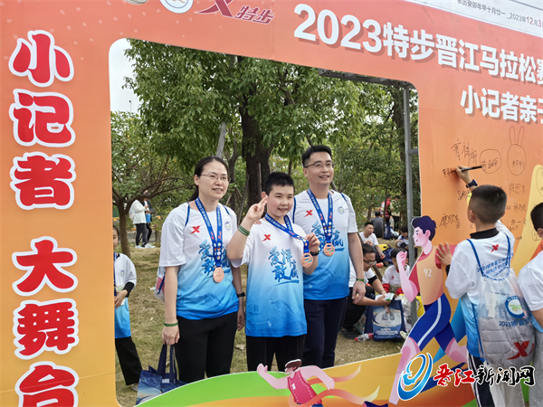 健康跑的终点站是草庵。跑到终点,拿到完赛包,小记者和爸爸妈妈被现场的互动体验活动和美食深深吸引,完全忘了比赛的疲惫。“小记者 大舞台”拍照墙是最受小记者欢迎的打卡点之一。一到这里,晋江市第三实验小学桥南校区小记者漆思赫和爸爸漆浩毅立刻拿出纪念奖牌拍照。漆浩毅告诉记者,他从今年5月份开始跑步,按照“跑二休一”的计划坚持了大半年,瘦了20多斤,“第一次参加马拉松,健康跑对我来说比较轻松。下一届晋马,我们还来!”