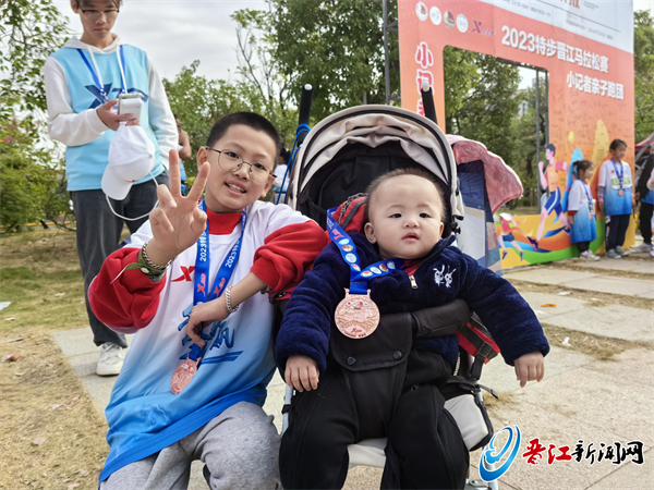 在小记者跑团里,有一组亲子很特别,妈妈曾希玲带着11岁的儿子和10个月大的女儿参赛。一路上,曾希玲和儿子施凯文轮流推着婴儿车,有时走、有时跑。婴儿车里,10个月大的小禧玥一开始还在睡觉,过了5公里路程,她睡醒了,就安静地坐在车里,“见证”妈妈、哥哥抵达终点,完成挑战。