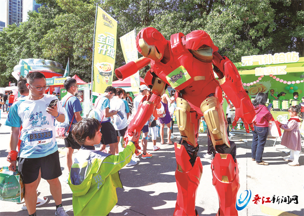 现场,跑友们冲过终点后,前行两三百米,便可到达完赛区领取完赛包。在现场工作人员的引导下,跑友们打卡品牌形象墙,品尝土笋冻、拳头母、菜粿、肉粕等晋江古早味小吃,邂逅网红后备厢餐车,观赏瑜伽舞韵、高甲戏、武术、歌曲等精彩表演,参与簪花、飞行棋等互动游戏。