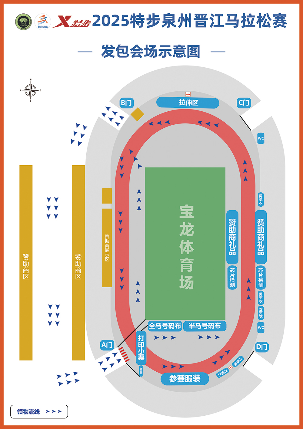 领物流程:先到所属号码段窗口领取号码布(含计时芯片)、参赛手环;再到“参赛服领取处”领参赛服、参赛包;所有选手需到芯片检测窗口检测计时芯片;随后到“物资包领取处”,回收“领物小票”后领取参赛物资。领物结束,如有疑问联系现场工作人员或志愿者,确认无误后从B门离开。