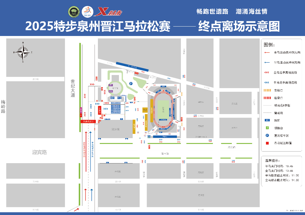 为保障跑友安心完赛、安全返程,组委会还安排了多条离场疏散路线。参赛跑友通过终点龙门后,将经过完赛物资发放区、赞助商展示区、冰敷区、拉伸区、存包区、更衣区、美食区等,然后从晋江市体育中心南门离场。离场后,跑友可选择迎宾路、高阳路、晓鸣路、宾阳路、永丰路、永嘉路、长宁路、长青路、崇德路等路线疏散,步行或换乘公交车辆返程。