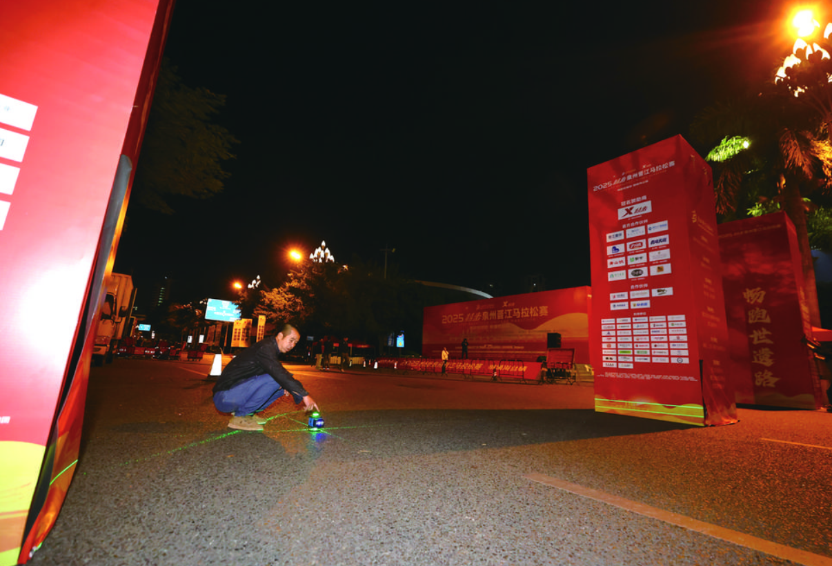 工作人员连夜布置晋马起跑点,迎接赛事到来。 记者 董严军 摄