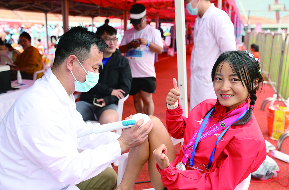 赛道内,除了固定医疗点位,80名医师跑者身着统一红色服装,在参赛队伍中作为最近的医疗力量时刻伴随。“我们的任务是随时观察身边选手的状态,一旦发现跑友身体状况出现异常,立刻上前处置。”拥有多年跑马经验的医师跑者熊华平说。