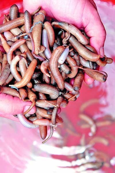 4.用清水煮熟后,把土笋放在手心揉搓,去掉土笋的外皮。